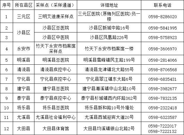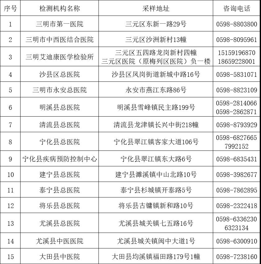 三明市核酸检测采样点信息