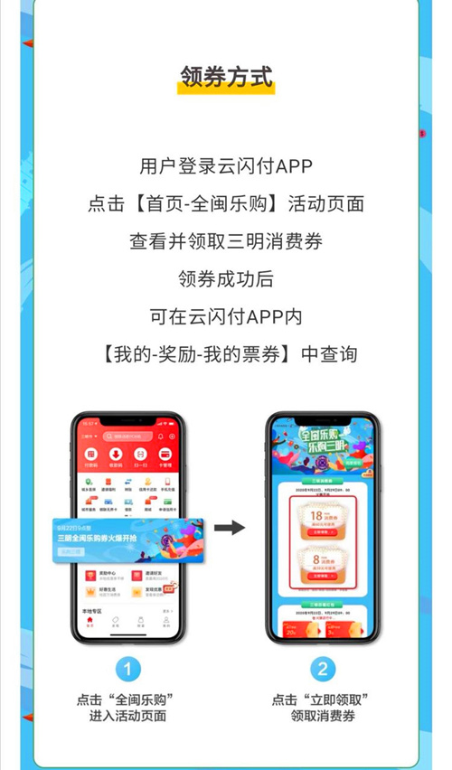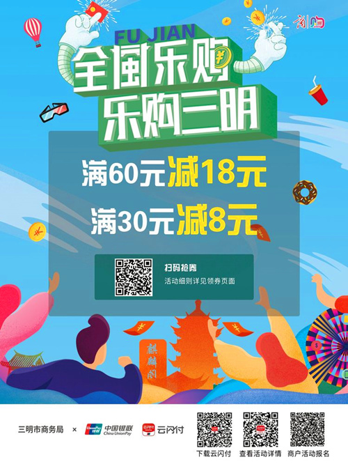 为持续激活消费市场,拉动经济发展,扎实做好“六稳”工作、全面落实“六保”任务。三明市政府决定从今年9月至明年元月,通过“云闪付”平台分期发放3000万元“全闽乐购•乐购三明”消费券(简称乐购券)。