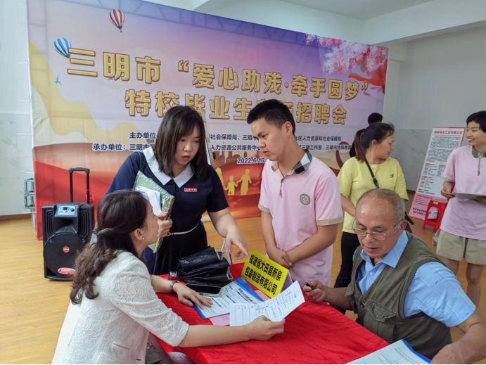 6月16上午,家住沙县区的市特校2022届毕业生黄同学十分欣喜,他在当日举办的“爱心助残.牵手圆梦”三明市特殊教育学校2022届毕业生专场招聘会上,与福建居敬泽惠养老产业发展有限公司签订了就业协议,工作地点就在沙县区,实现了家门口就业。