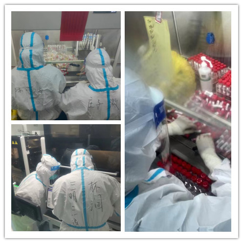 应急队到达基地,稍作休整,立即加入省立方舱,各就各位投入紧张的核酸检测中。