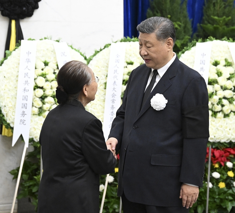 6月12日,热地同志遗体在北京八宝山革命公墓火化。习近平、李强、赵乐际、王沪宁、蔡奇、丁薛祥、李希等前往八宝山送别。这是习近平与热地亲属握手,表示深切慰问。新华社记者 谢环驰 摄