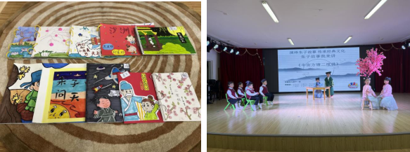以课程为载体,深入挖掘朱子文化,使之物化为课程资源,充分展现朱子文化魅力。一是特色课程感悟朱子礼仪。开发“一体两翼”的朱子文化特色课程体系,激发幼儿学习朱子文化的兴趣。“一体”,就是改编《童蒙须知》“衣服冠履”、“语言步趋”、“洒扫涓洁”、“读书写文字”与“杂细事宜”为现代意义的活动课程体系。“两翼”是指将《朱子问天》《沈郎沙画》《朱子面》等朱熹故事改编成绘本、制作成教育短片,将《朱子家训》《朱熹诗词》中部分适合幼儿启蒙教育的内容,改编成幼儿诵读经典供幼儿学习。二是日常活动渗透朱子礼仪。注重渗透教育促进幼儿感知朱子礼仪文化,抓住一日生活的每一个契机,在入园活动、自由时光、餐后环节、离园活动中都渗透礼仪教育。如在读“勿以善小而不为,勿以恶小而为之”时, 教师结合幼儿日常行为,巧妙自编故事《这不是我丢的》,将发生在幼儿身边乱扔玩具的事例以形象趣味的故事形式再现,引导幼儿在理解中学习。三是游戏活动践行朱子礼仪。将朱子文化融入到三大游戏、创意戏剧之中,促进幼儿良好品质的养成。如开展角色游戏“朱子美食街”时,为幼儿提供真实食材,注重让幼儿在游戏中学会制作朱子美食,践行朱子礼仪;开展朱子创意戏剧表演活动,大胆创新朱子故事内容,将《半亩方塘二度桃》《朱子问天》《沙洲画卦》等故事进行改编,通过创意戏剧的形式呈现,让幼儿在唱、跳、演的过程中增进对朱子文化的了解,领略朱子文化魅力。
