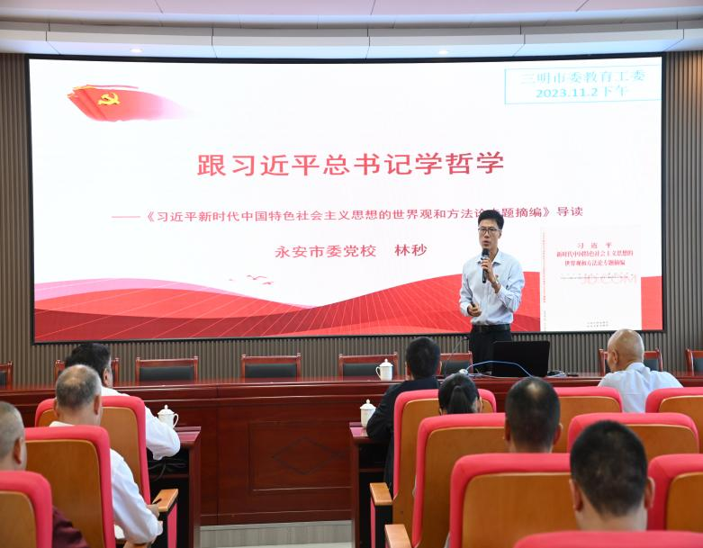 专题辅导学方法。为深入学习领会和深刻把握习近平新时代中国特色社会主义思想的世界观和方法论,11月2日下午,读书班邀请永安市委党校副校长、高级讲师、福建省首批新时代宣讲师林秒作《跟习近平总书记学哲学——<习近平新时代中国特色社会主义思想的世界观和方法论专题摘>编导读》讲座,从“‘新思想’世界观方法论的重大意义”“‘新思想’世界观方法论的丰富内涵”“‘新思想’世界观方法论的实践运用”三个方面,结合大量的案例深入浅出地阐述习近平新时代中国特色社会主义思想的世界观与方法论。辅导内容丰富,针对性强,各学员收获满满、深受启发。