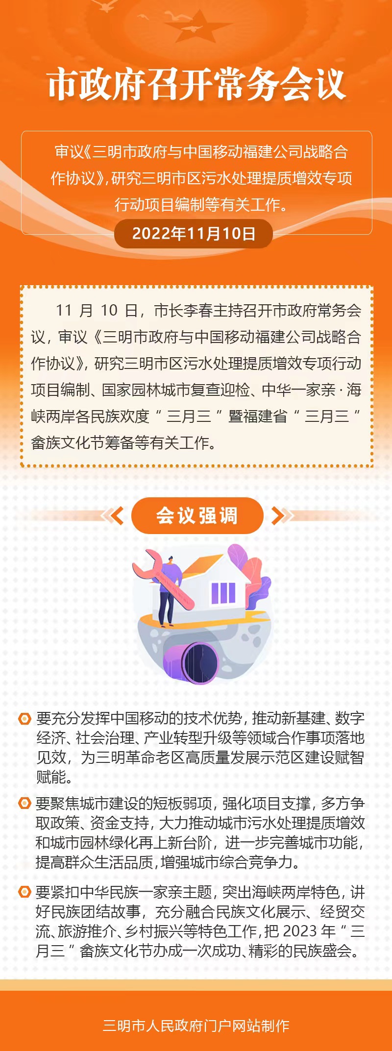 图解:市政府常务会议-审议《三明市政府与中国移动福建公司战略合作协议》,研究三明市区污水处理提质增效专项行动项目编制等有关工作